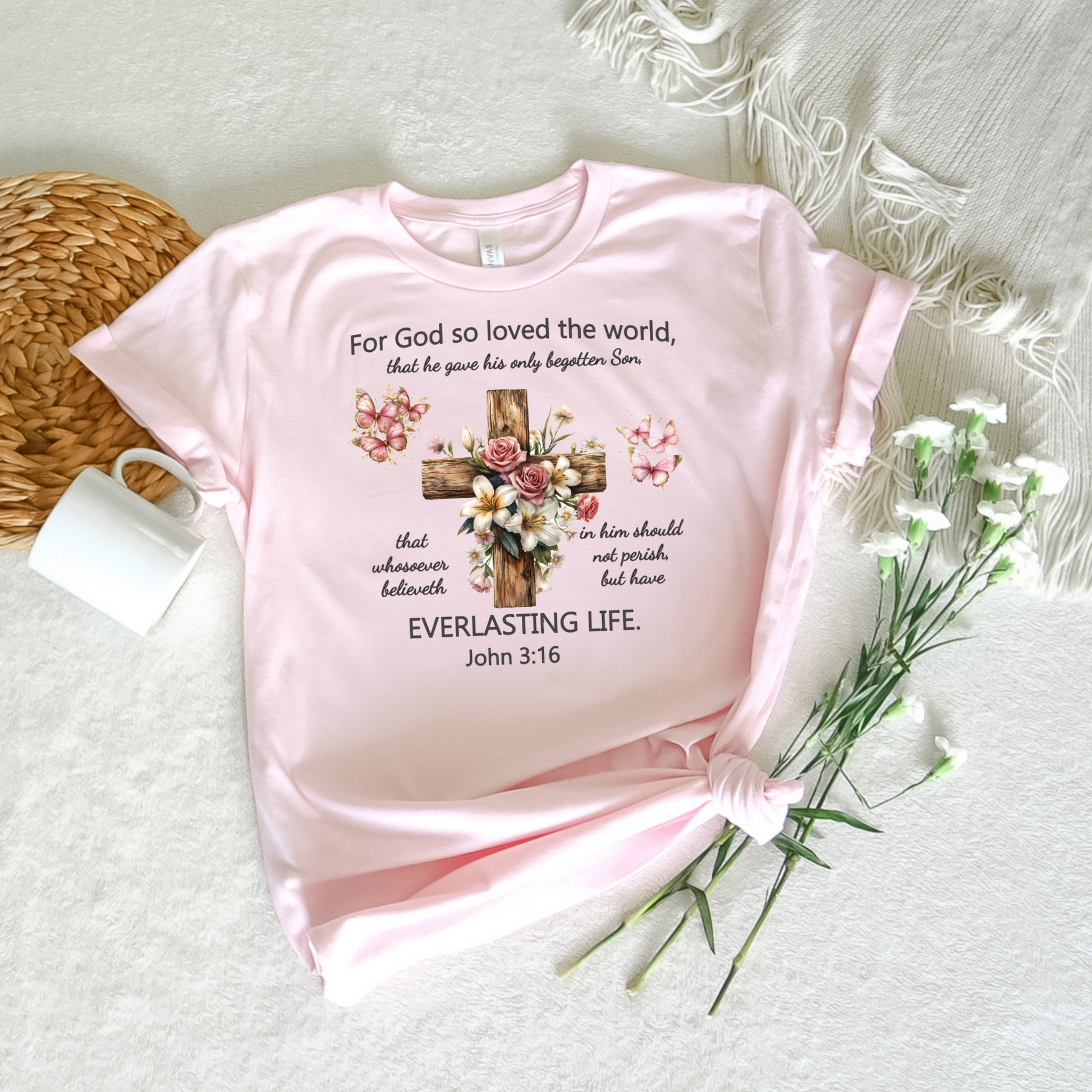 Whether you're running errands, attending Bible study, or simply enjoying time with loved ones, this tee is a meaningful way to wear your faith and spark conversation about John 3:16.