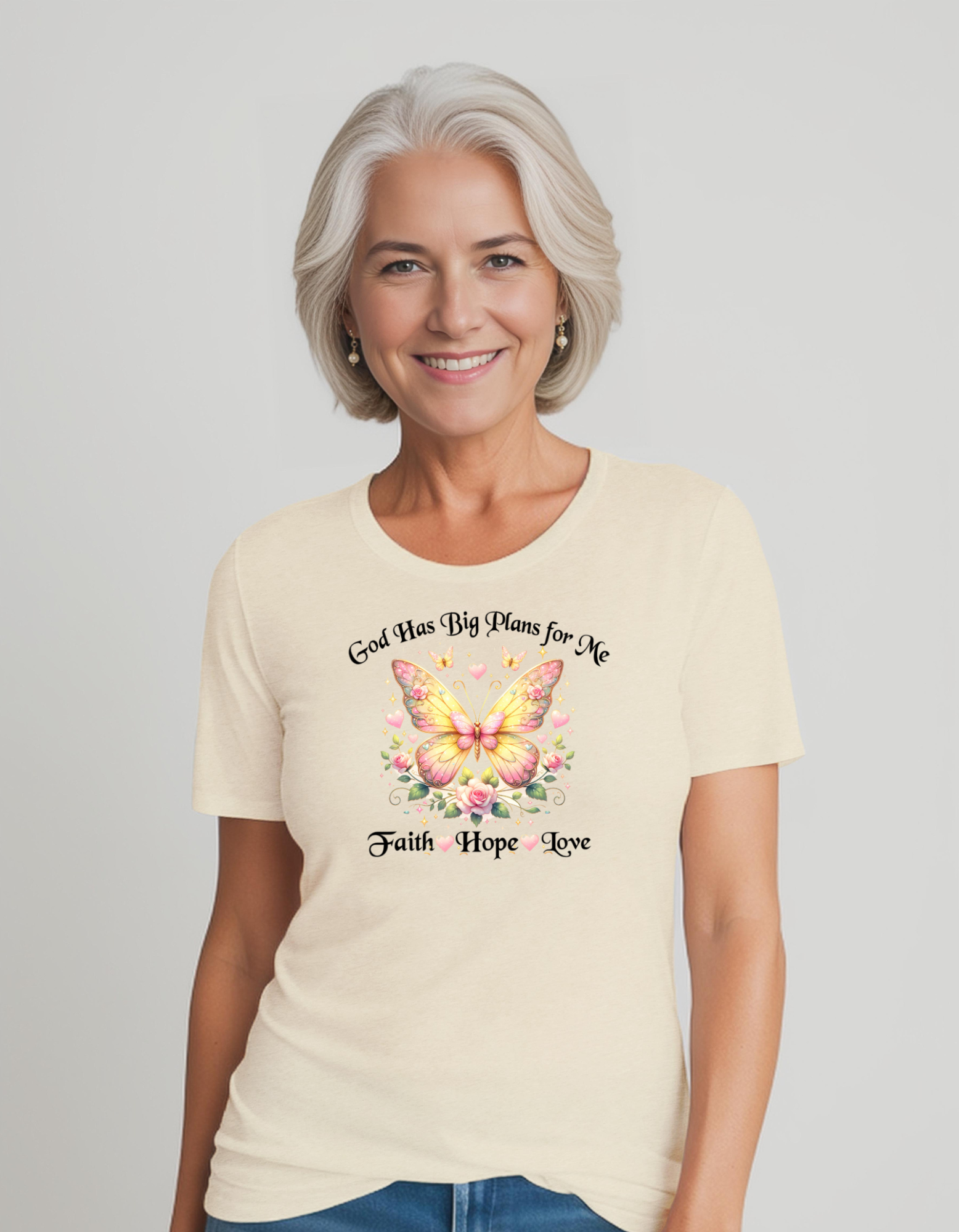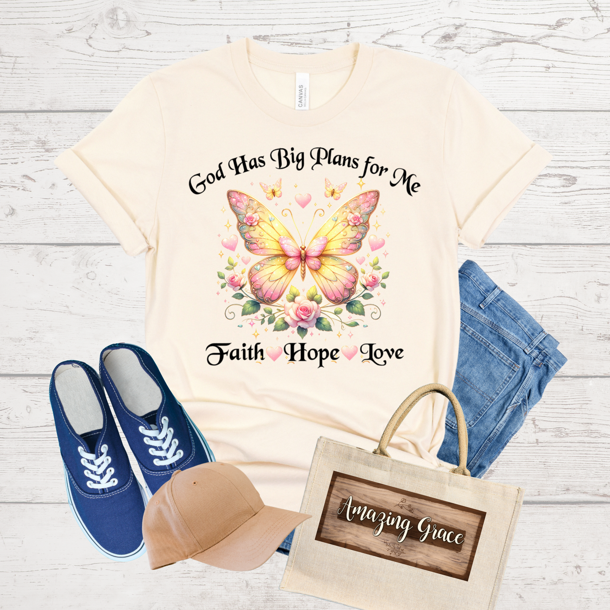 Step into faith and purpose with our "God Has Big Plans for Me" women's graphic tee. Designed to inspire and uplift, this shirt is a bold reminder of the hope and future promised in Jeremiah 29:11.