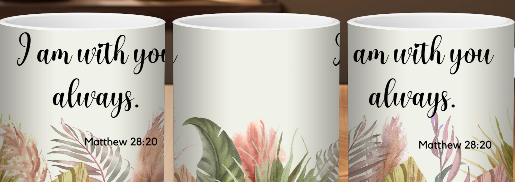 Start your day with comfort and encouragement with this beautifully crafted 15 oz white stoneware mug. Featuring the uplifting Christian message "I Am With You Always", this mug serves as a daily reminder of God's constant presence.