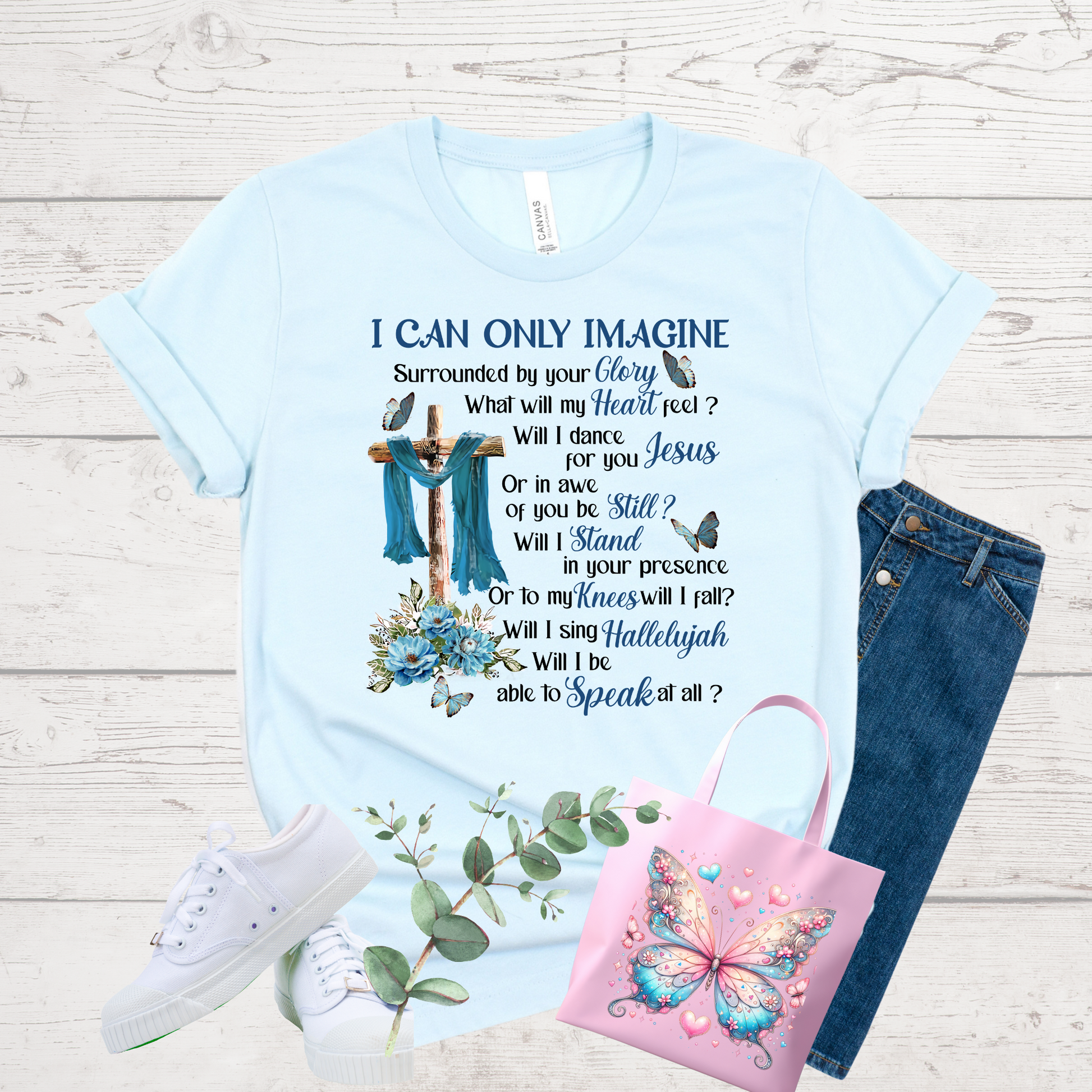 Inspired by the beautiful and beloved worship song, our Women's Christian T-Shirt features the powerful message: "I Can Only Imagine."