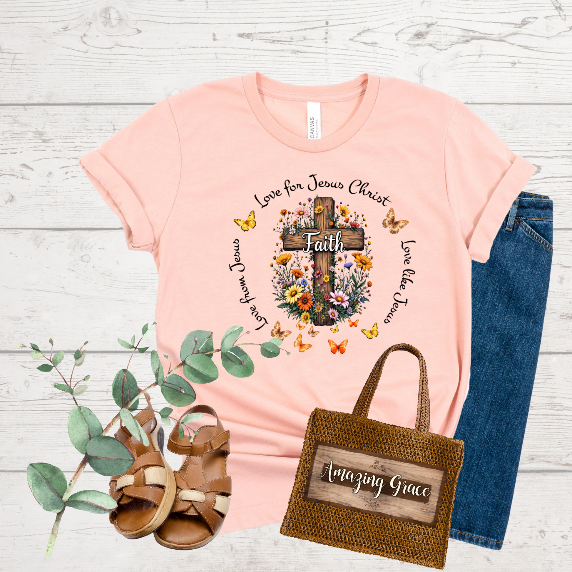 Let your heart shine with the message of Christ's love in this beautifully soft Women's Christian T-Shirt. Featuring the powerful words: "Love for Jesus, Love from Jesus, Love like Jesus" — this tee is a daily reminder of the love we receive and are called to share.