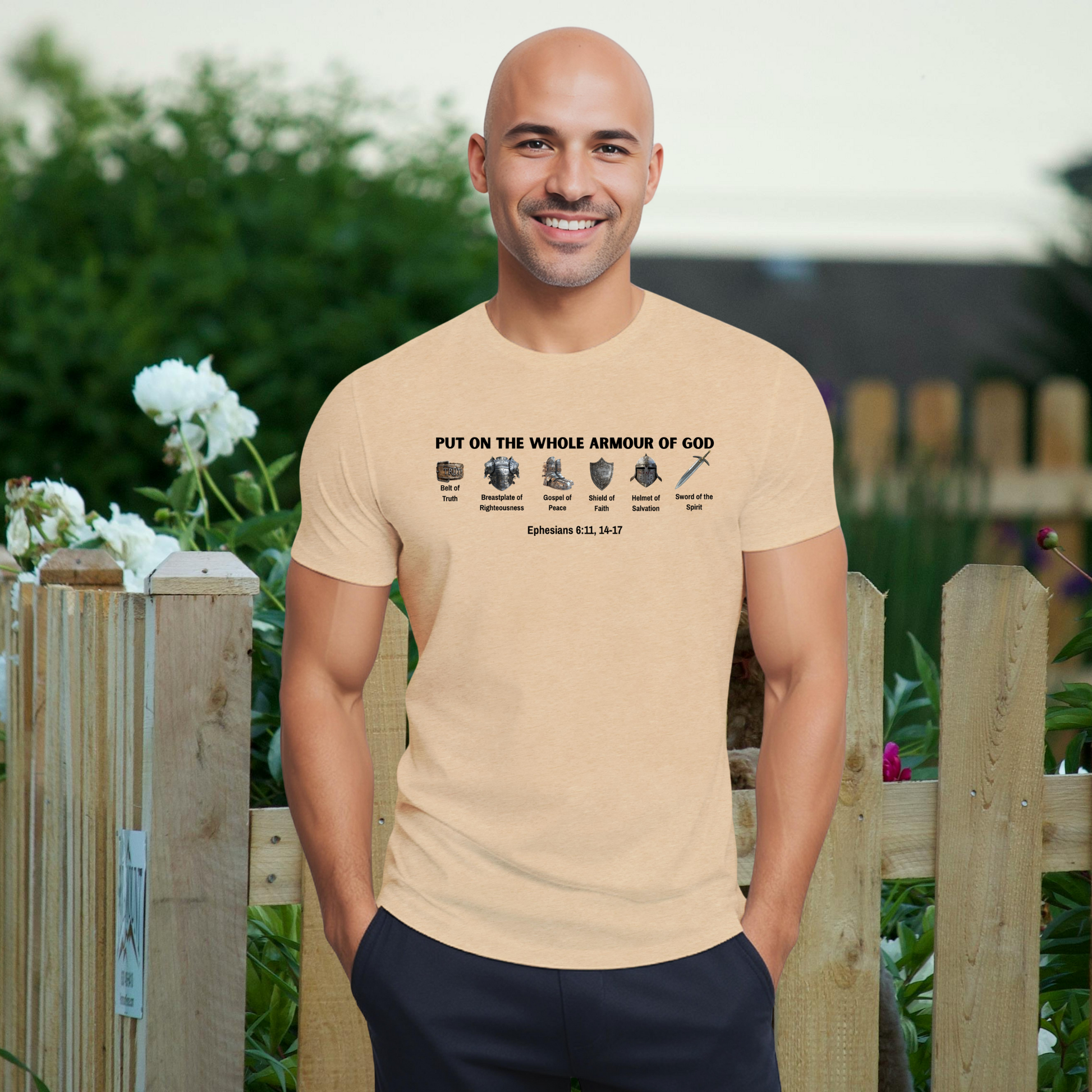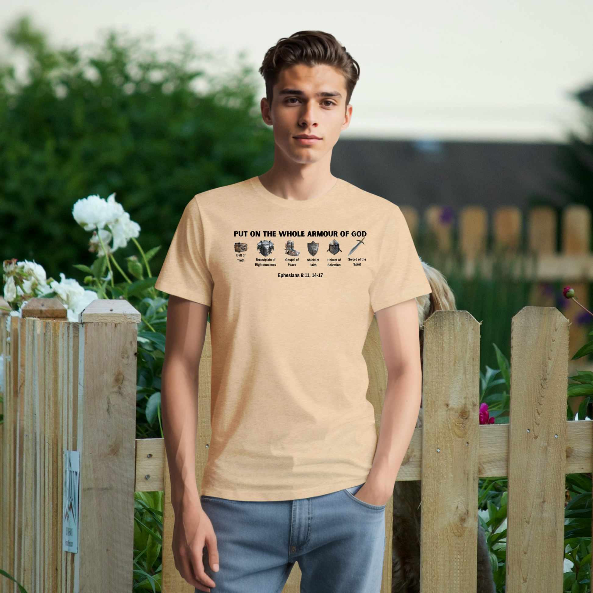 Stand strong in faith with this men’s “Put on the Whole Armour of God” T-shirt, inspired by Ephesians 6:11, 14-17. Crafted from a premium blend of 52% airlume combed and ringspun cotton and 48% polyester, this short-sleeve crew neck offers exceptional comfort, softness, and durability. The heather sand dune color pairs effortlessly with any casual look, while the bold Scripture design serves as a daily reminder to walk in God’s strength and protection. Perfect for church, fellowship, or everyday wear.