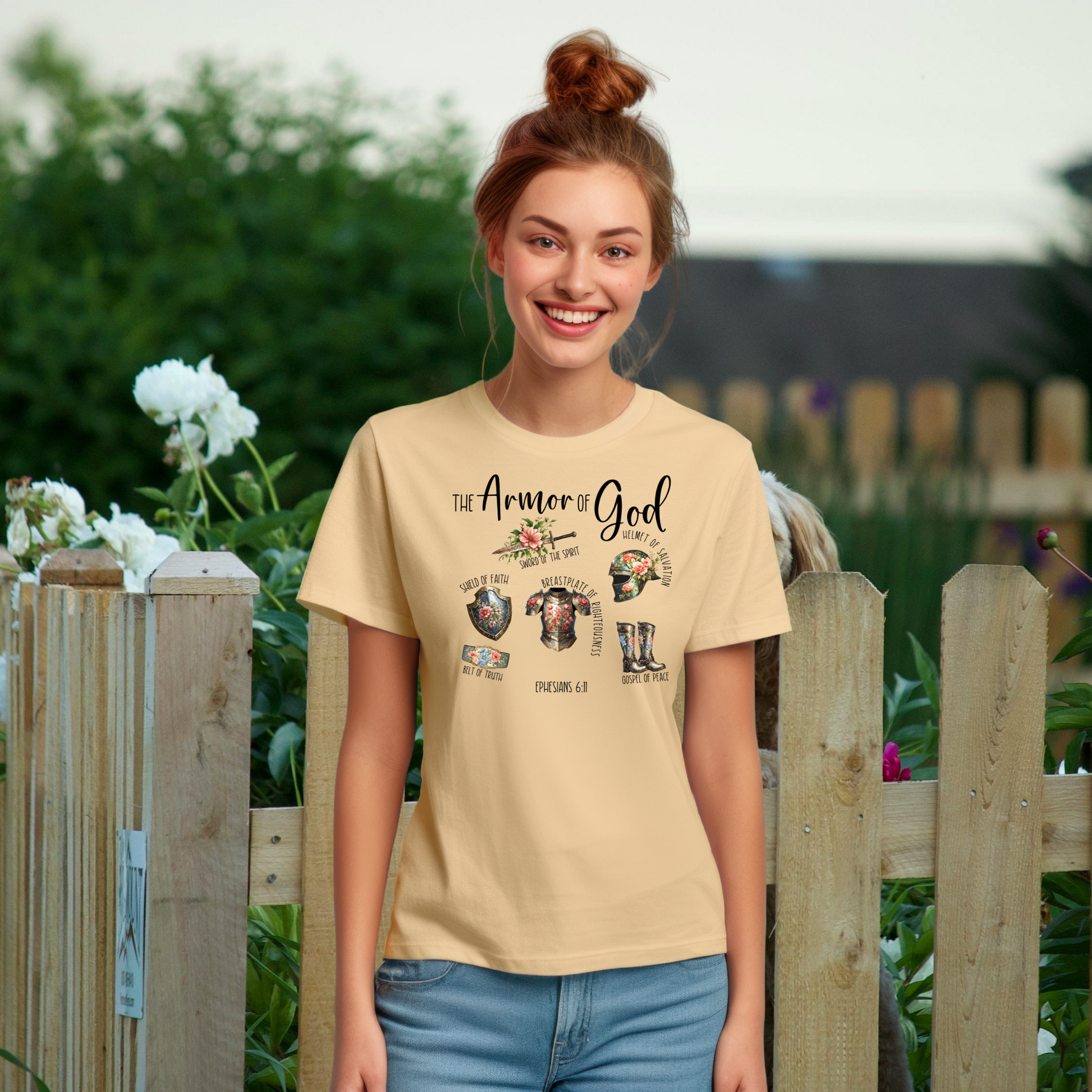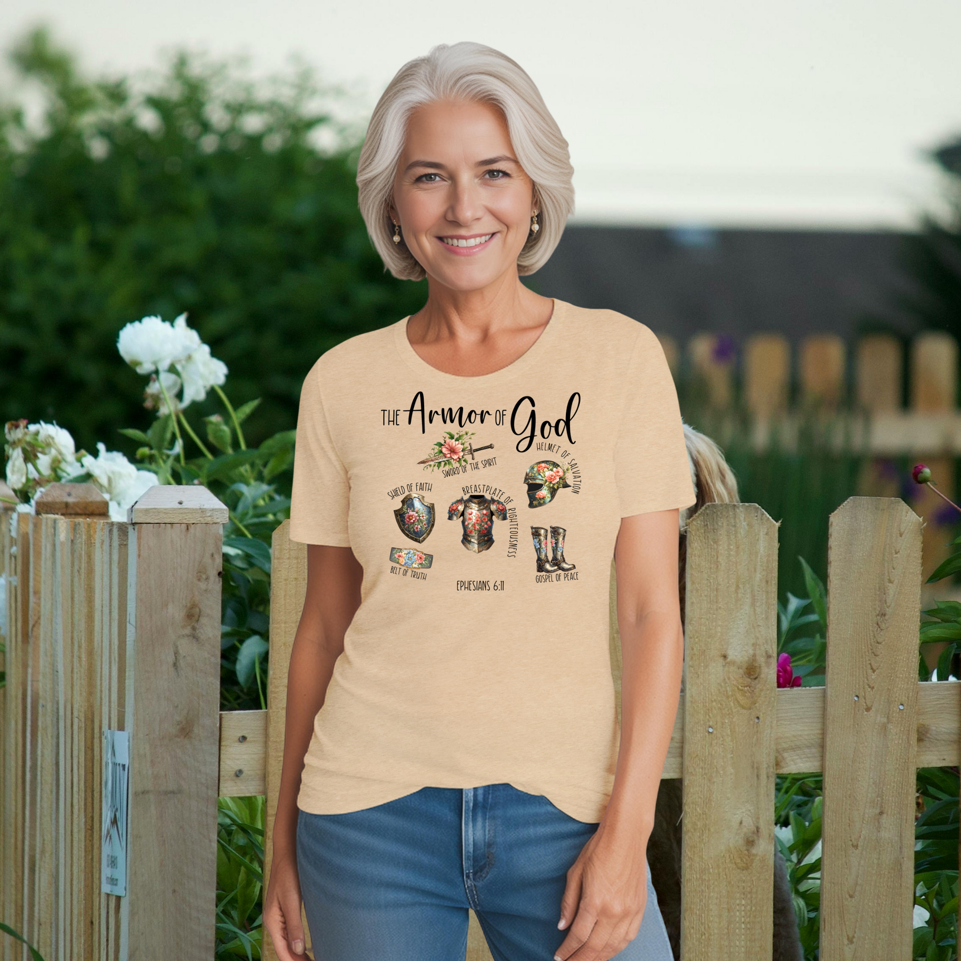 Stand strong in faith with this beautiful Armor of God tee, inspired by Ephesians 6:11: “Put on the full armor of God, so that you can take your stand against the devil’s schemes.” Crafted from a premium blend of 52% airlume combed and ringspun cotton and 48% polyester, this shirt is incredibly soft, lightweight, and perfect for all-day wear. The heather sand dune color gives it a warm, versatile look, while the short sleeves and classic crew neck make it a timeless wardrobe staple. Ideal for Bible study, fellowship events, or everyday encouragement.