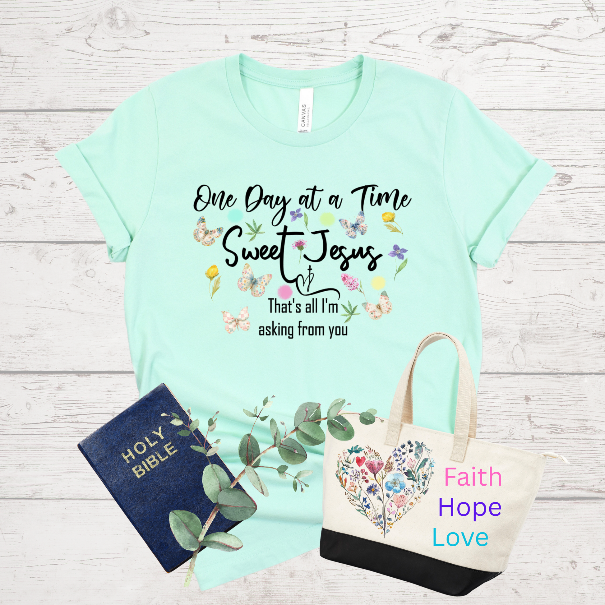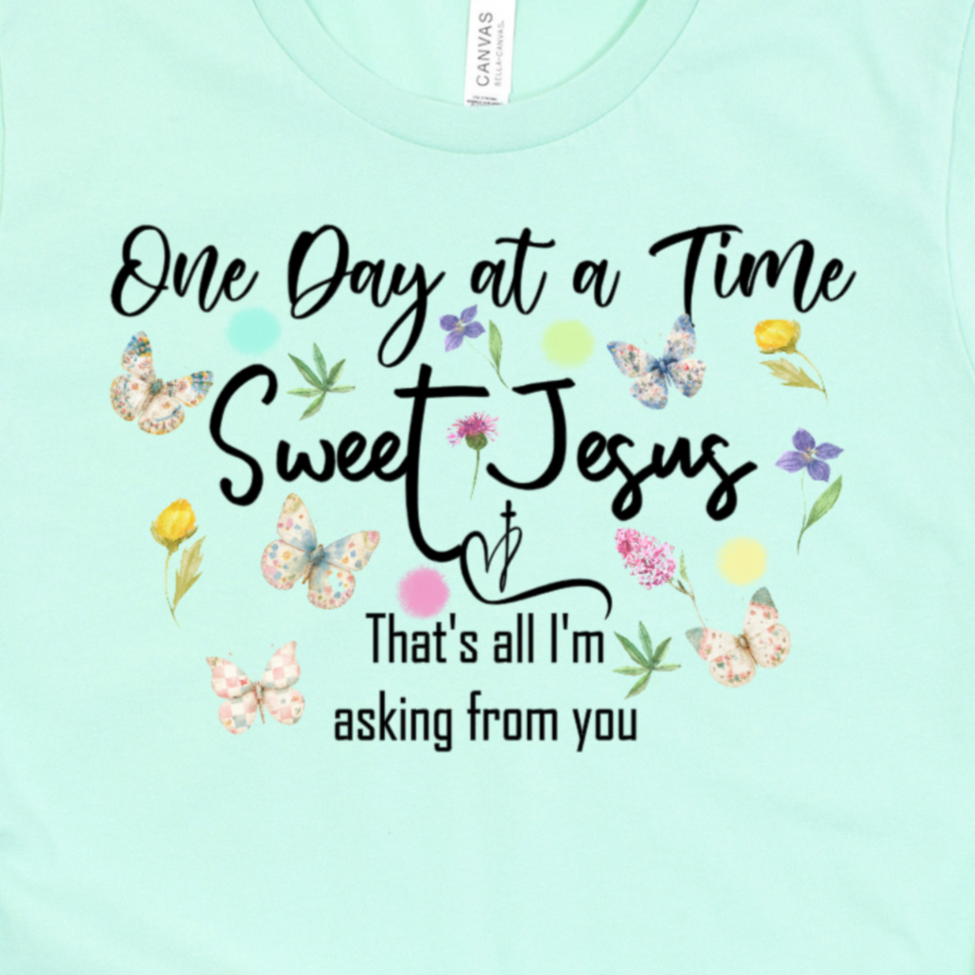 Find strength in every step with our "One Day at a Time Sweet Jesus" Women's Christian T-Shirt—a gentle reminder to walk in faith, hope, and love each day.